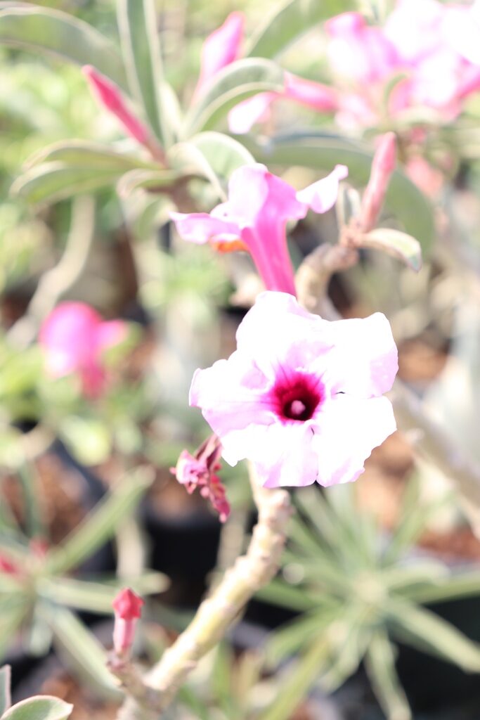 Adenium swazicum is a species of desert rose whose gray-green leaves appear folded and are velvety to touch (Figure 1). It is sought after by collectors for its graceful, weeping branches and delicate flowers that occur in various shades of pink (Figure 1 and 2). Adenium swazicum is a smaller plant with weaker branches and stems compared to other Adenium species such as Adenium obesum or Adenium arabicum.